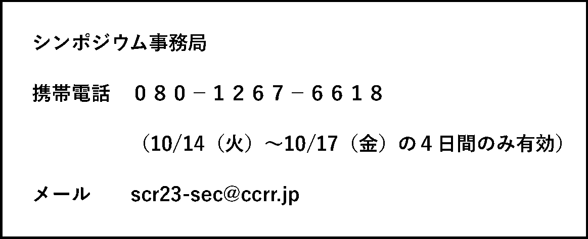 第23回建設ロボットシンポジウムの開催にあたり、当日の緊急連絡先を下記のとおりご案内申し上げます. 体調不良、交通遅延など、至急のご連絡が必要な場合は、下記連絡先までご一報ください.
